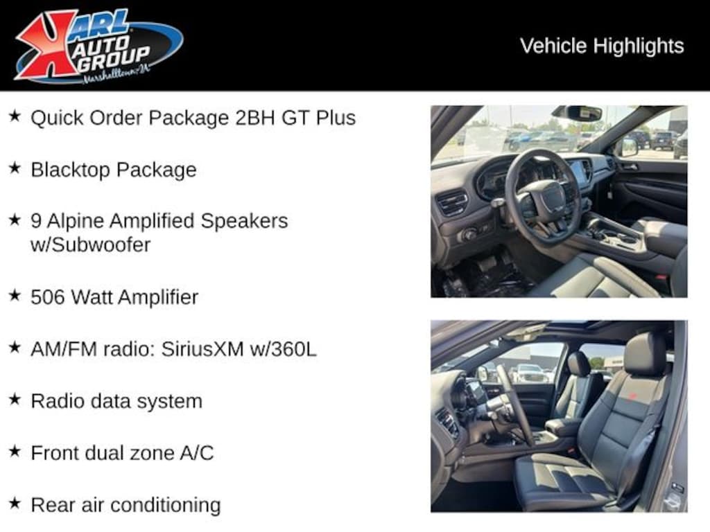 When you buy a new car at Karl or Marshalltown you know you're finding a vehicle you can rely on. We have a great selection of new vehicles for you to test drive around Newton and Des Moines, IA. We also pride ourselves in creating a friendly atmosphere and reliable new car dealership that you can trust. Call us with any questions about our 2026 Dodge Durango and our experts will be glad to help you! (641) 752-7101. *Equipment and options are generated by a 3rd party vendor, exact vehicle options may vary. Please see a salesperson for complete details and vehicle information. Price includes: $1000 - 2026 Midwest BC Bonus Cash . Exp. 11/03/2025 $1000 - 2026 National Engine Retail Bonus Cash . Exp. 11/03/2025