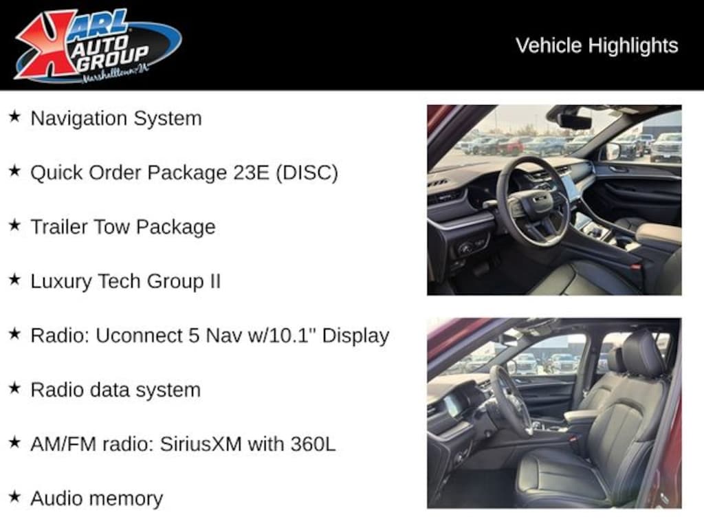 When you buy a new car at Karl or Marshalltown you know you're finding a vehicle you can rely on. We have a great selection of new vehicles for you to test drive around Newton and Des Moines, IA. We also pride ourselves in creating a friendly atmosphere and reliable new car dealership that you can trust. Call us with any questions about our 2025 Jeep Grand Cherokee and our experts will be glad to help you! (641) 752-7101. *Equipment and options are generated by a 3rd party vendor, exact vehicle options may vary. Please see a salesperson for complete details and vehicle information. Price includes: $2250 - 2025 National Retail Bonus Cash . Exp. 01/05/2026