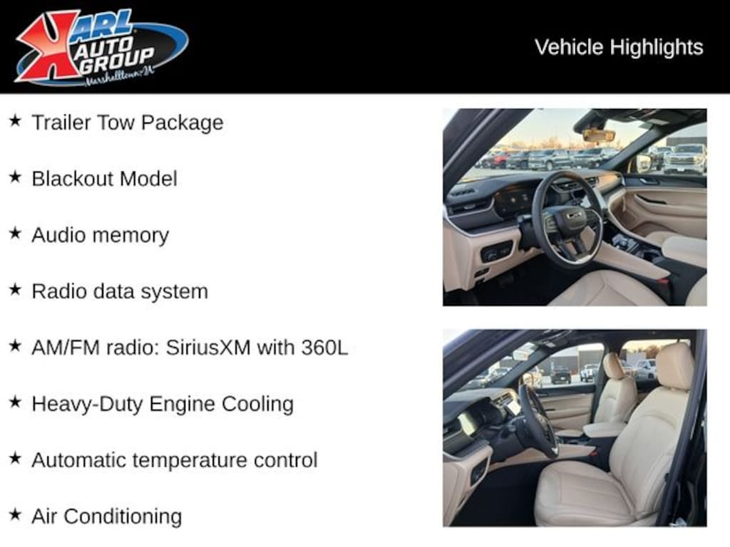 When you buy a new car at Karl or Marshalltown you know you're finding a vehicle you can rely on. We have a great selection of new vehicles for you to test drive around Newton and Des Moines, IA. We also pride ourselves in creating a friendly atmosphere and reliable new car dealership that you can trust. Call us with any questions about our 2025 Jeep Grand Cherokee and our experts will be glad to help you! (641) 752-7101. *Equipment and options are generated by a 3rd party vendor, exact vehicle options may vary. Please see a salesperson for complete details and vehicle information. Price includes: $1000 - 2026 Midwest BC SFS Retail Bonus Cash. Exp. 01/20/2026 $2250 - 2025 National Retail Bonus Cash . Exp. 02/02/2026