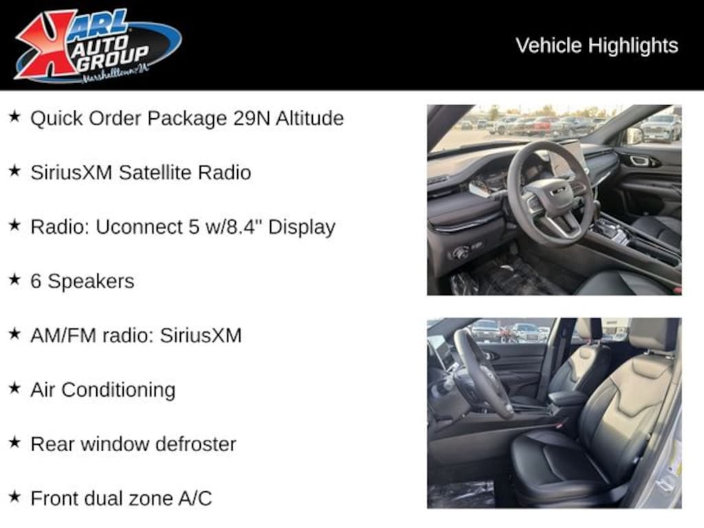 When you buy a new car at Karl or Marshalltown you know you're finding a vehicle you can rely on. We have a great selection of new vehicles for you to test drive around Newton and Des Moines, IA. We also pride ourselves in creating a friendly atmosphere and reliable new car dealership that you can trust. Call us with any questions about our 2026 Jeep Compass and our experts will be glad to help you! (641) 752-7101. *Equipment and options are generated by a 3rd party vendor, exact vehicle options may vary. Please see a salesperson for complete details and vehicle information. Price includes: $1000 - 2026 National Retail Bonus Cash . Exp. 01/05/2026 $2000 - 2026 National Holiday Select Inventory Bonus Cash. Exp. 01/05/2026