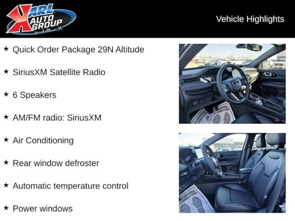 When you buy a new car at Karl or Marshalltown you know you're finding a vehicle you can rely on. We have a great selection of new vehicles for you to test drive around Newton and Des Moines, IA. We also pride ourselves in creating a friendly atmosphere and reliable new car dealership that you can trust. Call us with any questions about our 2026 Jeep Compass and our experts will be glad to help you! (641) 752-7101. *Equipment and options are generated by a 3rd party vendor, exact vehicle options may vary. Please see a salesperson for complete details and vehicle information. Price includes: $1000 - 2026 National Retail Bonus Cash . Exp. 04/30/2026 $500 - 2026 Midwest BC Retail Bonus Cash . Exp. 04/30/2026