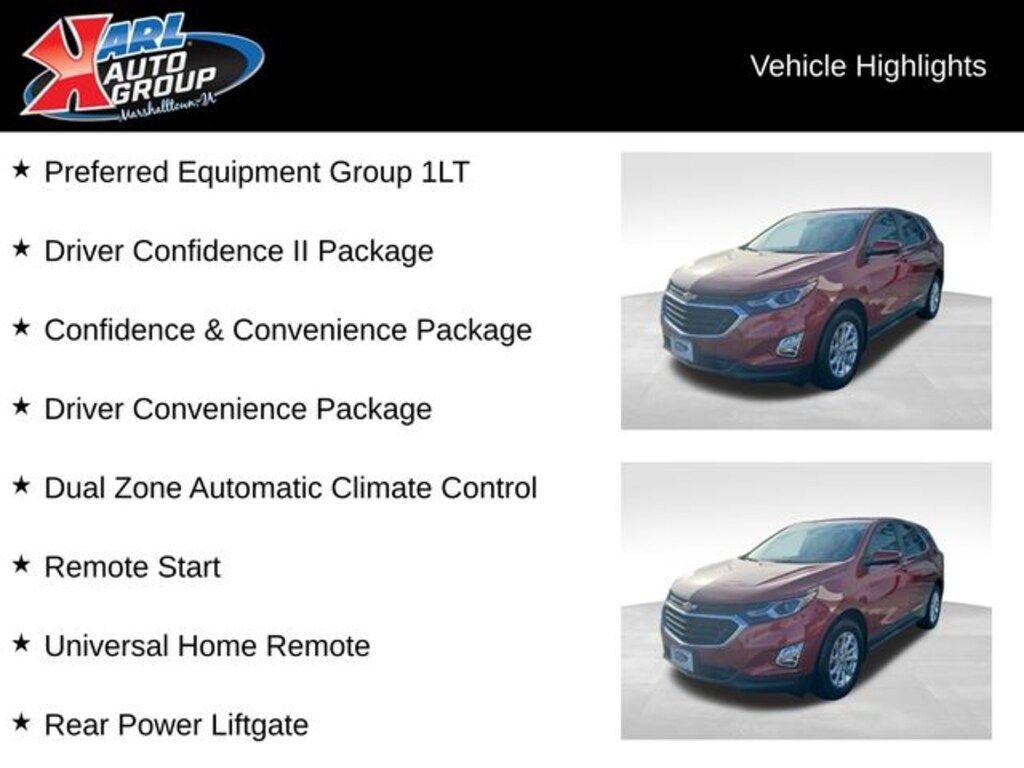 Recent Arrival! Odometer is 43493 miles below market average! Certified. CARFAX One-Owner. Cajun Red Tintcoat 2021 Chevrolet Equinox 4D Sport Utility LT 1.5L DOHC 26/31 City/Highway MPG 6-Speed Automatic Electronic with Overdrive FWD, 3-Spoke Leather-Wrapped Steering Wheel, Confidence & Convenience Package, Driver Confidence II Package, Driver Convenience Package, Dual Zone Automatic Climate Control, Front Fog Lamps, Heated Driver & Front Passenger Seats, Lane Change Alert w/Side Blind Zone Alert, Preferred Equipment Group 1LT, Rear Cross Traffic Alert, Rear Park Assist w/Audible Warning, Rear Power Liftgate, Remote Start, Universal Home Remote.