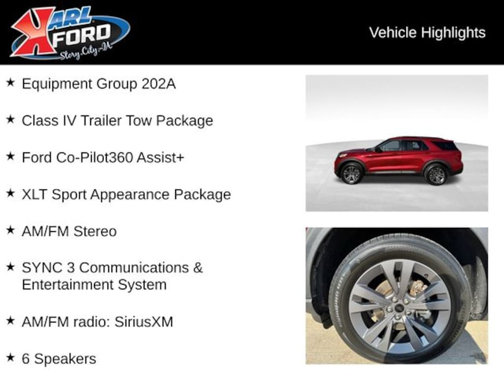 Your Dealer for Life, Karl Ford of Story City. When you buy a new car at Karl Ford of Story City you know you're finding a vehicle you can rely on. We have a great selection of new vehicles for you to test drive around Ames and Des Moines, IA. We also pride ourselves in creating a friendly atmosphere and reliable new car dealership that you can trust. Call us with any questions about our 2023 Ford Explorer and our experts will be glad to help you! (515) 733-4364. *Equipment and options are generated by a 3rd party vendor, exact vehicle options may vary. Please see a salesperson for complete details and vehicle information.