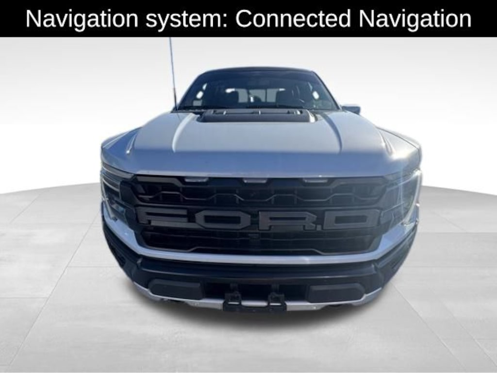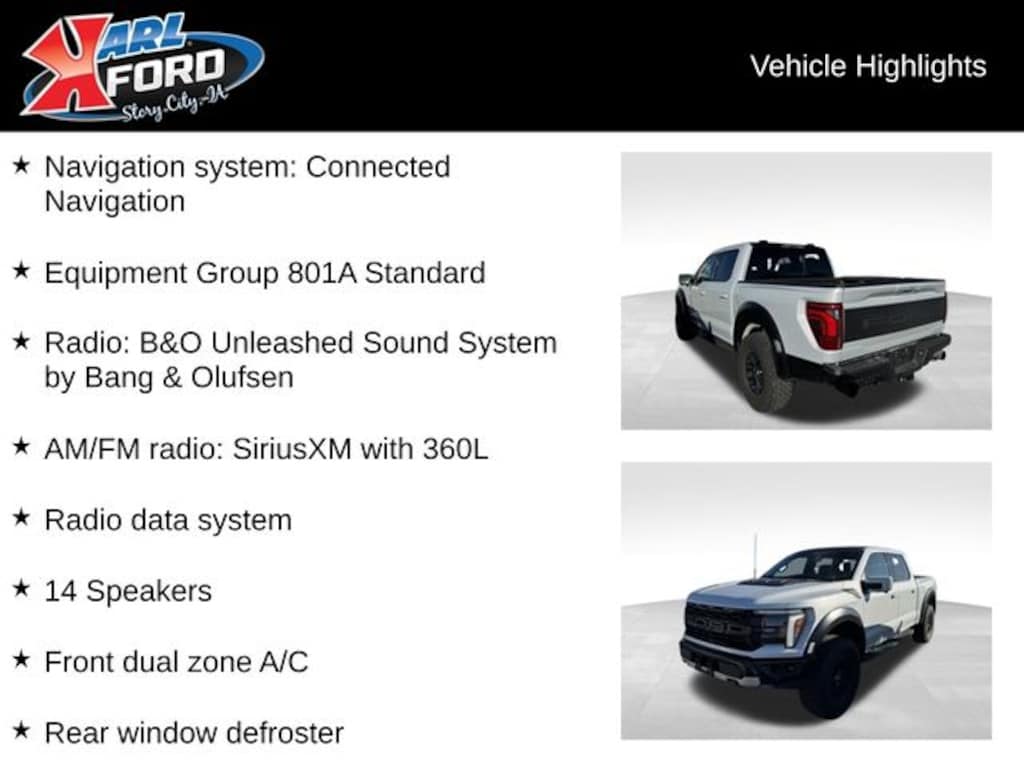 This 2025 Ford F-150 comes equipped with, F-150 Raptor, 4D SuperCrew, 3.5L V6 EcoBoost, 10-Speed Automatic, 4WD, White Metallic, Black Leather, 14 Speakers, 17" Cast Aluminum Wheels, 4-Wheel Disc Brakes, ABS brakes, Adjustable pedals, Air Conditioning, Alloy wheels, AM/FM radio: SiriusXM with 360L, Auto High-beam Headlights, Auto tilt-away steering wheel, Auto-dimming door mirrors, Auto-dimming Rear-View mirror, Automatic temperature control, Brake assist, Bumpers: body-color, Compass, Delay-off headlights, Driver door bin, Driver vanity mirror, Dual front impact airbags, Dual front side impact airbags, Electronic Locking w/4.10 Axle Ratio, Electronic Stability Control, Emergency communication system: SYNC 4 911 Assist, Equipment Group 801A Standard, Front anti-roll bar, Front Bucket Seats, Front Center Armrest, Front dual zone A/C, Front fog lights, Front License Plate Bracket, Front reading lights, Front wheel independent suspension, Fully automatic headlights, Garage door transmitter, Heads-Up Display, Heated door mirrors, Heated front seats, Heated rear seats, Heated steering wheel, Illuminated entry, Lane Departure Warning System, Leather steering wheel, Leather Trimmed Seats, Low tire pressure warning, Memory seat, Navigation system: Connected Navigation, Occupant sensing airbag, Outside temperature display, Overhead airbag, Overhead console, Panic alarm, Passenger door bin, Passenger vanity mirror, Pedal memory, Power door mirrors, Power driver seat, Power passenger seat, Power steering, Power windows, Radio data system, Radio: B&O Unleashed Sound System by Bang & Olufsen, Rain sensing wipers, Rear reading lights, Rear step bumper, Rear window defroster, Remote keyless entry, Security system, Speed control, Speed-sensing steering, Split folding rear seat, Steering wheel memory, Steering wheel mounted audio controls, SYNC 4 w/Enhanced Voice Recognition, Tachometer, Telescoping steering wheel, Tilt steering wheel, Tough Bed Spray-In Bedliner, Traction control, Trip computer, Turn signal indicator mirrors, Variably intermittent wipers, Ventilated front seats.