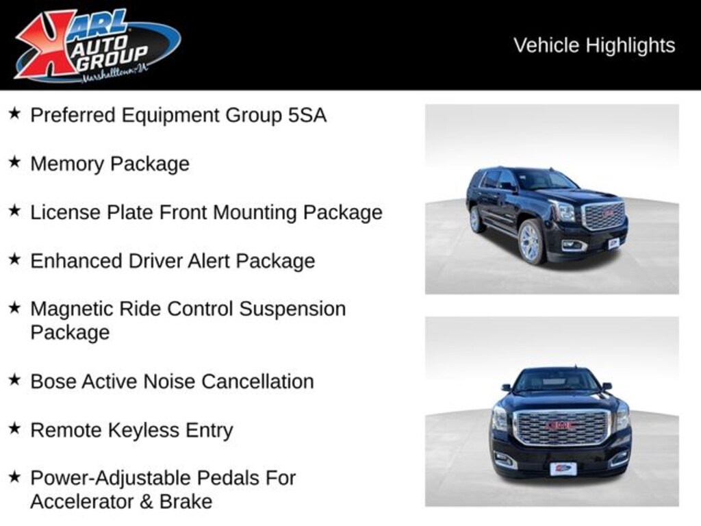 Recent Arrival! Certified. Onyx Black 2019 GMC Yukon 4D Sport Utility Denali EcoTec3 6.2L V8 14/22 City/Highway MPG 10-Speed Automatic with Overdrive 4WD, 4-Wheel Antilock Disc Brakes, 5 Auxiliary 12-volt Power Outlets, Black Assist Steps w/Chrome Strip, Bose Active Noise Cancellation, Enhanced Driver Alert Package, Forward Collision Alert, Hands Free Power Programmable Rear Liftgate, Heated Leather-Wrapped Steering Wheel, Inside Rear-View Auto-Dimming Mirror, Integrated Trailer Brake Controller, IntelliBeam Automatic High Beam On/Off, Lane Change Alert w/Side Blind Zone Alert, Lane Keep Assist w/Lane Departure Warning, License Plate Front Mounting Package, Low Speed Forward Automatic Braking, Magnetic Ride Control Suspension Package, Memory Package, Passive Entry System, Power Release 2nd Row Bucket Seats, Power Tilt & Telescopic Steering Column, Power-Adjustable Pedals For Accelerator & Brake, Preferred Equipment Group 5SA, Push Button Keyless Start, Rear Cross Traffic Alert, Remote Keyless Entry, Universal Home Remote, Wireless Charging.