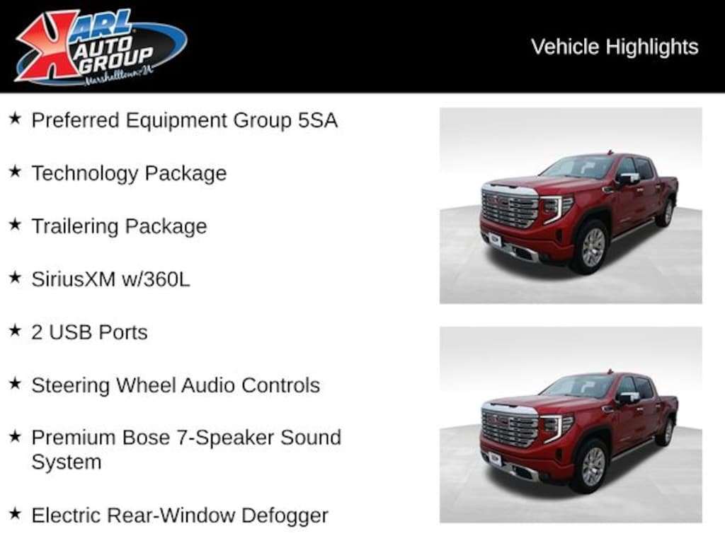 Recent Arrival! Certified. CARFAX One-Owner. Volcanic Red Tintcoat 2023 GMC Sierra 1500 4D Crew Cab Denali EcoTec3 6.2L V8 15/19 City/Highway MPG 10-Speed Automatic 4WD, Jet Black Leather, 120-Volt Bed Mounted Power Outlet, 120-Volt Instrument Panel Power Outlet, 170 Amp Alternator, 2 Charge/Data USB Ports Inside Center Console, 2 Type-C Charge-Only Rear USB Ports, 2 USB Ports, Adaptive Cruise Control, Auto-Locking Rear Differential, Auxiliary External Transmission Oil Cooler, Bed View Camera, Chrome Header w/Signature Denali Chrome Grille, Chrome Recovery Hooks, Chrome Wheel To Wheel Assist Steps, Color-Keyed Carpeting Floor Covering, Compass, Deep-Tinted Glass, Electric Rear-Window Defogger, Electrical Steering Column Lock, Floor-Mounted Center Console, Front Rainsensing Wipers, GMC Connected Access Capable, HD Surround Vision, Heated 2nd Row Outboard Seats, Heated Driver & Front Outboard Passenger Seating, Heavy-Duty Air Filter, Hill Descent Control, Hitch Guidance, Hitch Guidance w/Hitch View, In-Vehicle Trailering App, Integrated Trailer Brake Controller, Keyless Open & Start, LED Cargo Area Lighting, Multicolor 15" Diagonal Head-Up Display, OnStar & GMC Connected Services Capable, Perimeter Lighting, Power Door Locks, Power Front Passenger Windows w/Express Up/Down, Power Front Windows w/Driver Express Up/Down, Power Rake & Telescoping Steering Column, Power Rear Windows w/Express Down, Power Sliding Rear Window w/Rear Defogger, Preferred Equipment Group 5SA, Premium Bose 7-Speaker Sound System, Push Button Start, Rear Camera Mirror, Rear Cross Traffic Braking, Rear Pedestrian Detection, Rear Wheelhouse Liners, Remote Vehicle Starter System, SiriusXM w/360L, Spray-On Pickup Bed Liner w/Denali Logo, Steering Wheel Audio Controls, Technology Package, Theft Deterrent System (Unauthorized Entry), Trailer Camera Provisions, Trailer Side Blind Zone Alert, Trailering Package, Ultrasonic Front & Rear Park Assist, Universal Home Remote, Ventilated Driver & Front Passenger Seats, Wi-Fi Hotspot Capable, Wireless Charging, Wireless Phone Projection.