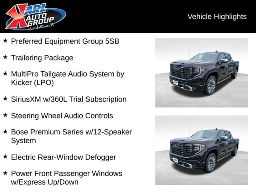 Recent Arrival! Certified. CARFAX One-Owner. Clean CARFAX. Onyx Black 2025 GMC Sierra 1500 4D Crew Cab Denali Ultimate 3.0L I6 22/26 City/Highway MPG 10-Speed Automatic 4WD, Alpine Umber Leather, 120-Volt Bed Mounted Power Outlet, 120-Volt Interior Power Outlet, 2 Charge/Data USB Ports Inside Center Console, 2 Type-C Charge-Only Rear USB Ports, 2 USB Ports, Auto-Locking Rear Differential, Bed View Camera, Bose Premium Series w/12-Speaker System, Chrome Recovery Hooks, Color-Keyed Carpeting Floor Covering, Deep-Tinted Glass, Electric Rear-Window Defogger, Floor-Mounted Center Console, Front Rain-Sensing Wipers, HD Surround Vision, Heated 2nd Row Outboard Seats, Heated Driver & Front Outboard Passenger Seating, Heavy-Duty Air Filter, High Gloss Black Header w/Signature Denali Grille, Hill Descent Control, Hitch Guidance, Hitch View, In-Vehicle Trailering System App, Integrated Trailer Brake Controller, Keyless Open & Start, LED Cargo Area Lighting, Multicolor 15" Diagonal Head-Up Display, MultiPro Tailgate Audio System by Kicker (LPO), OnStar Services Capable, Perimeter Lighting, Power Door Locks, Power Front Passenger Windows w/Express Up/Down, Power Front Windows w/Driver Express Up/Down, Power Rake & Telescoping Steering Column, Power Rear Windows w/Express Down, Power Sliding Rear Window w/Rear Defogger, Power Sunroof, Preferred Equipment Group 5SB, Push Button Start, Rear Cross Traffic Braking, Rear Pedestrian Detection, Rear Wheelhouse Liners, Remote Vehicle Starter System, SiriusXM w/360L Trial Subscription, Spray-On Pickup Bedliner w/GMC Logo, Steering Wheel Audio Controls, Theft Deterrent System (Unauthorized Entry), Trailer Camera Provisions, Trailer Side Blind Zone Alert, Trailer Tire Pressure Monitor System, Trailering Package, Ultrasonic Front & Rear Park Assist, Universal Home Remote, Ventilated Driver & Front Passenger Seats, Wi-Fi Hotspot Capable, Wireless Charging.