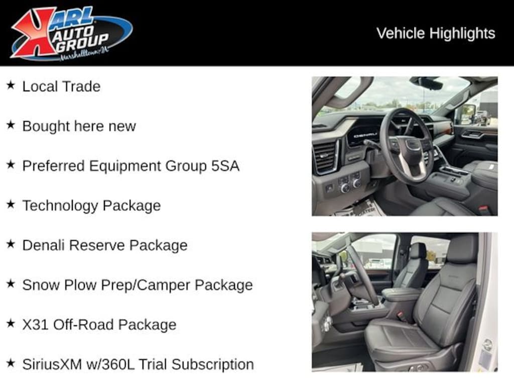 Recent Arrival! Local Trade, Bought here new, Odometer is 5439 miles below market average! Certified. CARFAX One-Owner. Clean CARFAX. Summit White 2025 GMC Sierra 2500HD 4D Crew Cab Denali Duramax 6.6L V8 Turbodiesel 10-Speed Automatic 4WD, Jet Black Leather, 120-Volt Bed Mounted Power Outlet, 120-Volt Instrument Panel Power Outlet, 2 Charge-Only Rear USB Ports, 2 Charge/Data USB Ports Inside Center Console, 2 USB Ports, 2-Speed Active Transfer Case, 220-Amp Alternator, Bed View Camera w/2 Trailer Camera Provisions, Bose Premium 7-Speaker Sound System, Deep-Tinted Glass, Denali Reserve Package, Electric Rear-Window Defogger, Floor-Mounted Center Console, Front Rain-Sensing Wipers, HD Surround Vision, Heated 2nd Row Outboard Seats, Heated Driver & Front Outboard Passenger Seats, Hill Descent Control, Inside Rearview Auto-Dimming Rear Camera Mirror, Keyless Open & Start, LED Cargo Area Lighting, LED Smoked Amber Roof Marker Lamps, Manual Tilt-Wheel/Telescoping Steering Column, Multicolor 15" Diagonal Head-Up Display, OnStar Services Capable, Polished Exhaust Tip, Power Front Passenger Windows w/Express Up/Down, Power Sliding Rear Window w/Defogger, Power Sunroof, Preferred Equipment Group 5SA, Push Button Start, Rear Cross Traffic Alert, Rear Wheelhouse Liners, Remote Vehicle Starter System, Safety Alert Seat, Signature Chrome Denali Grille, SiriusXM w/360L Trial Subscription, Snow Plow Prep/Camper Package, Spray-On Pickup Bedliner w/GMC Logo, Steering Wheel Audio Controls, Technology Package, Trailer Cam Provisions & Trailer Viewing Software, Trailer Side Blind Zone Alert, Ultrasonic Front & Rear Park Assist, Unauthorized Entry Theft-Deterrent System, Universal Home Remote, Ventilated Driver & Front Passenger Seats, Wireless Charging, Wireless Phone Projection, X31 Off-Road Package.