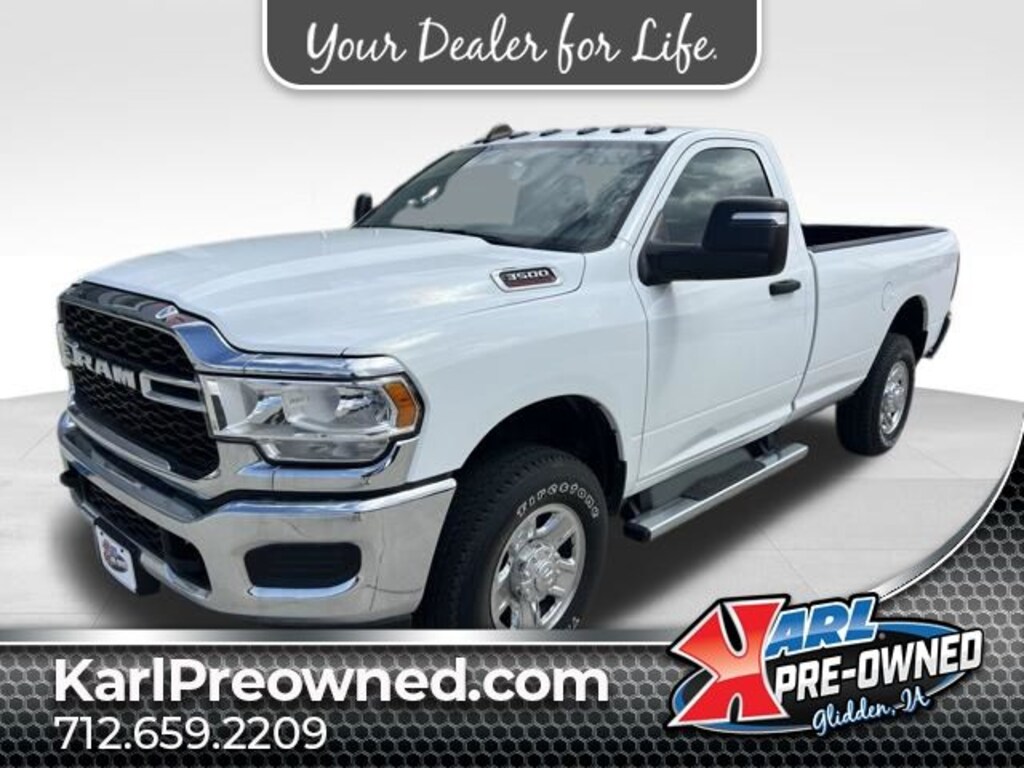 Built to handle the toughest jobs, this 2023 Ram 3500 Tradesman Regular Cab 4x4 Long Box delivers serious heavy-duty capability with a powerful 6.4L HEMI V8 and rugged 4x4 performance. Designed with work in mind, it features a 3.73 axle ratio, manual shift-on-the-fly transfer case, trailer sway damping, and available 5th wheel/gooseneck towing prepmaking it a perfect choice for hauling, towing, and getting the job done right.